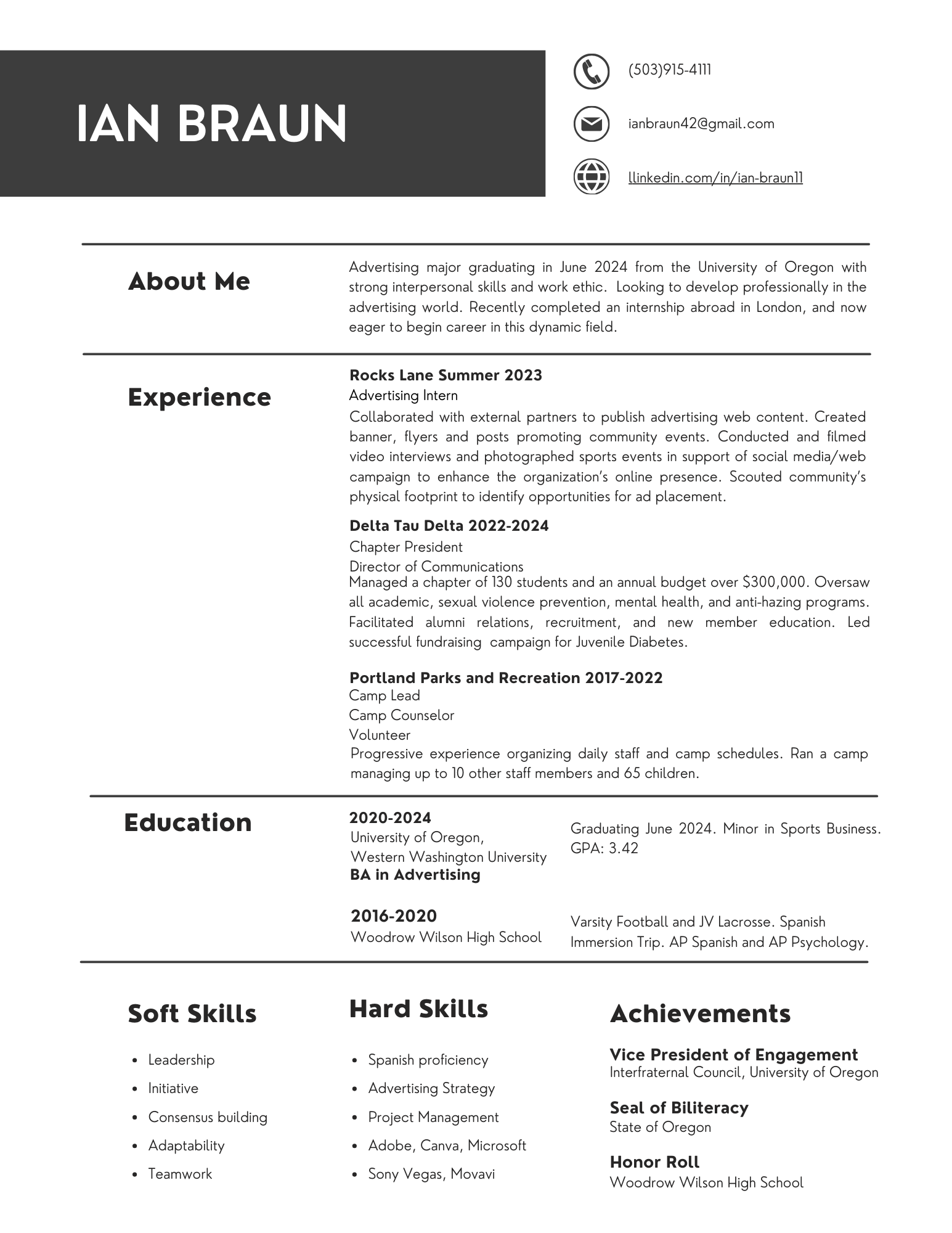 Let’s get in touch! Phone: (503) 915-4111Email: ianbraun42@gmail.comLinkedIn: linkedin.com/in/ian-braun11 Resume
